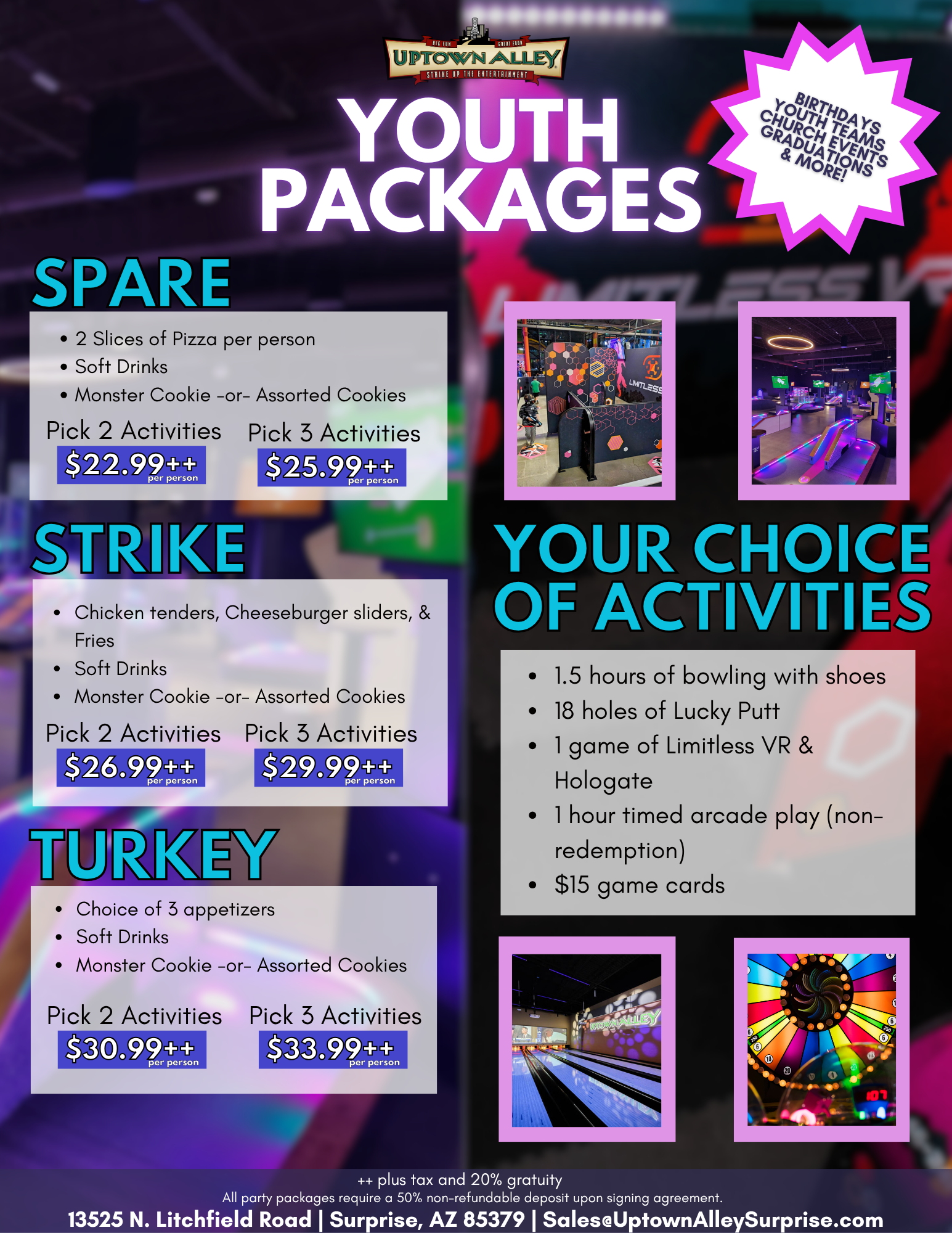 Uptown Alley’s School Event Package includes options for all types of group events; from Lock-ins, Prom Parties, and Graduation Events, to even Church and Youth outings, we cover it all! Enjoy our arcade, unlimited bowling, gaming options, and more! Contact us today so we can create memories you won’t forget.
